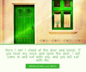 Revelation 3:20 (NIV) Here I am! I stand at the door and knock. If anyone hears my voice and opens the door, I will come in and eat with that person, and they with me.