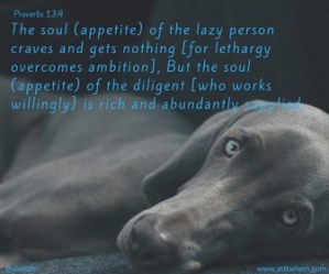 At times, I’ve been a slacker as far as my writing is concerned. I have allowed “stuff” to get in the way of what I know I should be doing. Although I “crave” to be all I can be through my writing, I am not fully satisfied. This verse in Proverbs was a huge eye-opener for me this morning. I want to be fully satisfied and have all God has promised me. But, I will never get there if I’m a slacker.